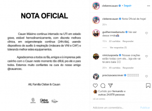 Segundo aviso publicado nesta quinta-feita, (20), na conta do instagram da dupla sertaneja, o cantor ainda continua internado em estado grave, mas com o quadro estável.